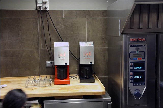 «The Jets» Hva mer kan man ønske seg når man har en PacoJet? En PacoJet til. Litt omtrentlig forklart er en PacoJet en kraftig mikser som ved hjelp av en kraftig motor og trykk forvandler en iskald dypfryst blanding til den jevneste iskrem eller sorbet. Dersom blandingen ikke har så mye sukker eller fett blir den til en fin snø, som pepperrotsnøen til knivskjellretten. Ovnen til høyre i bildet brukes til å bake brødene. | ||||